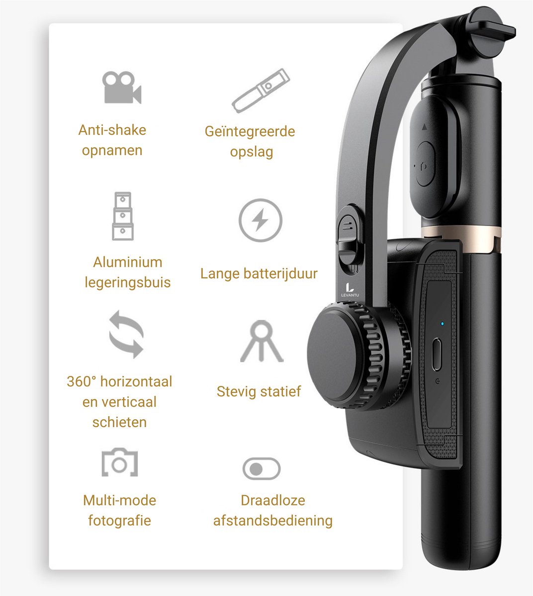 Of je nu een enthousiaste vlogger, een sportliefhebber of een wereldreiziger bent, deze multifunctionele selfiestick tilt je content naar een hoger niveau. Geen gedoe met meerdere apparaten of accessoires meer. Met één slimme, draagbare oplossing heb je altijd stabiele en professionele clips binnen handbereik. Krachtig, gebruiksvriendelijk en stijlvol – dat is de LEVANTU 3-in-1 Selfiestick en Gimbal.